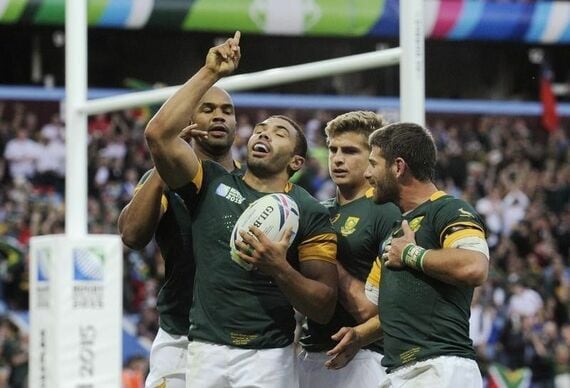 9月26日、ラグビーのW杯イングランド大会、1次リーグB組では前回日本に敗れた南アフリカがサモアに46─6で圧勝。写真はトライを喜ぶ南アフリカの選手たち(2015年 ロイター)