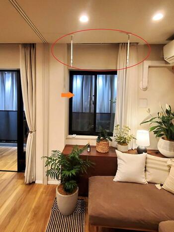 また、室内干しができるように、室内物干しも用意している。実は、物干しの下の、窓に向かって左側のガラス戸には、外側に通常の網戸を入れている。言われるまで気づかなかったほど、通常の網戸なら室内から外の見え方に違いは感じなかった。