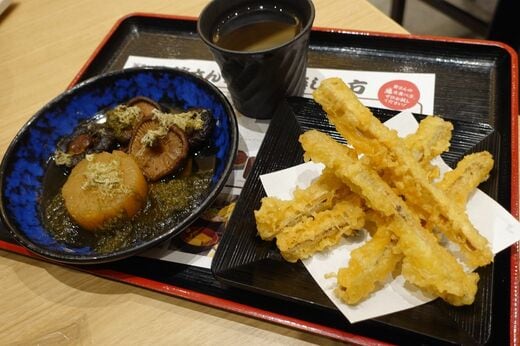 「資さん」でちょい呑み 麦焼酎水割り360円+おでん(大根、しいたけ)+ごぼ天(写真:筆者撮影)