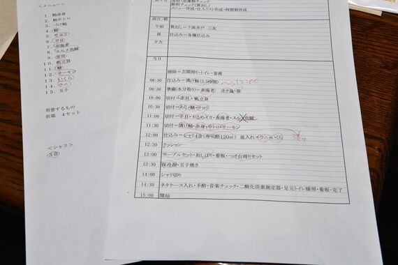 河野さんの大将歴も14年。出張寿司と貸し切りを合わせて年平均50回、週1回のペースで予約が入る。1回の予約で河野さんの実働は仕入れと仕込みで1日+当日1日の2日間が基本だ。タイムスケジュールを細かく書き出して落ち度がないように進めていく。