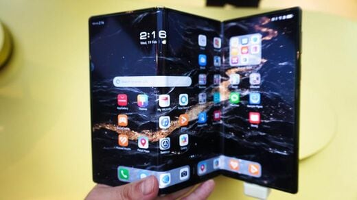 Mate XTは2回折りたためる構造を採用。2024年に中国で発表された同機種が世界で初めて実現した機能で、現時点で3つ折りスマートフォンを製品化できているのはファーウェイのみだ。Z字型の折りたたみ構造で、3つの異なる使い方ができる。