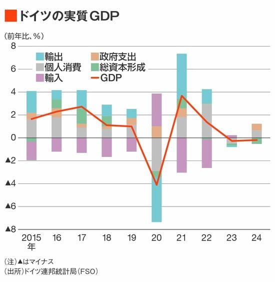 ドイツの名目GDP(国内総生産)はドル換算で2023年に日本を抜き、アメリカと中国に続いて世界第3位となった。この状況をして日本よりもドイツの経済が好調であるかのような報道も相次いだが、ドイツ経済の実情は極めて厳しい。実際、ドイツの2024年の実質GDPは前年比0.2%減と、2年連続でマイナス成長となった。