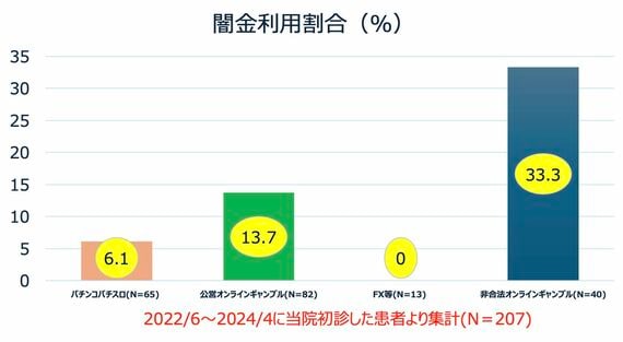 当院の外来受診患者の調査においても、オンラインカジノを行っていた者の闇金融利用率は他のギャンブルを行っていた者のそれよりも明らかに高く、約3人に1人が闇金融を利用している。