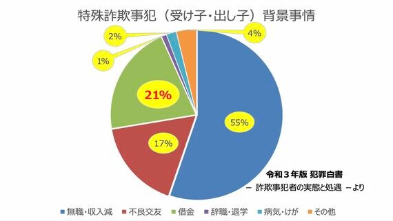 検挙された者の約21%が、借金返済を主な理由に特殊詐欺に加担している。