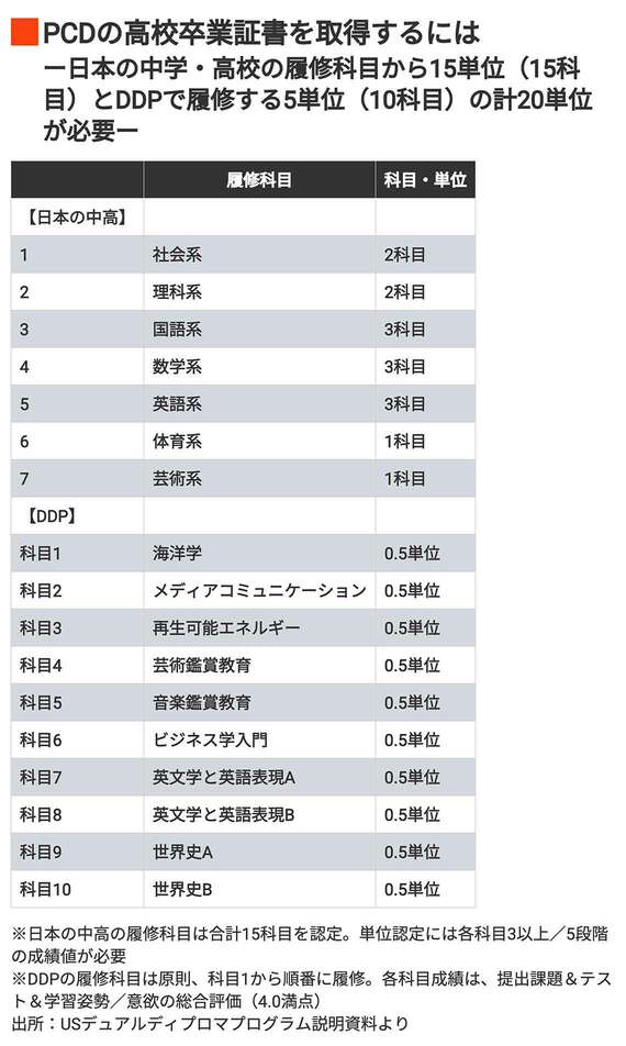日本の高校生がPCDの高校卒業証書を取得するためには、日本の中学3年から高校3年の4年間の履修科目から認定する15単位(15科目)と、DDPで履修する5単位(10科目)、計20単位が必要です。