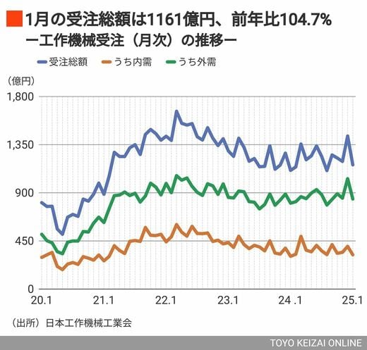 2025年1月の工作機械受注は1161.5億円。前月比は年末受注の反動でマイナス18.8%となったものの、前年同月比はプラス4.7%と、4カ月連続でプラスになっている。