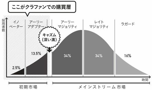 この理論で考えると、クラファンの利用者の多くは「最も早く新商品を取り入れる層(イノベーター)」と「トレンドに敏感で新商品採用にも積極的な層(アーリーアダプター)」といえるでしょう。