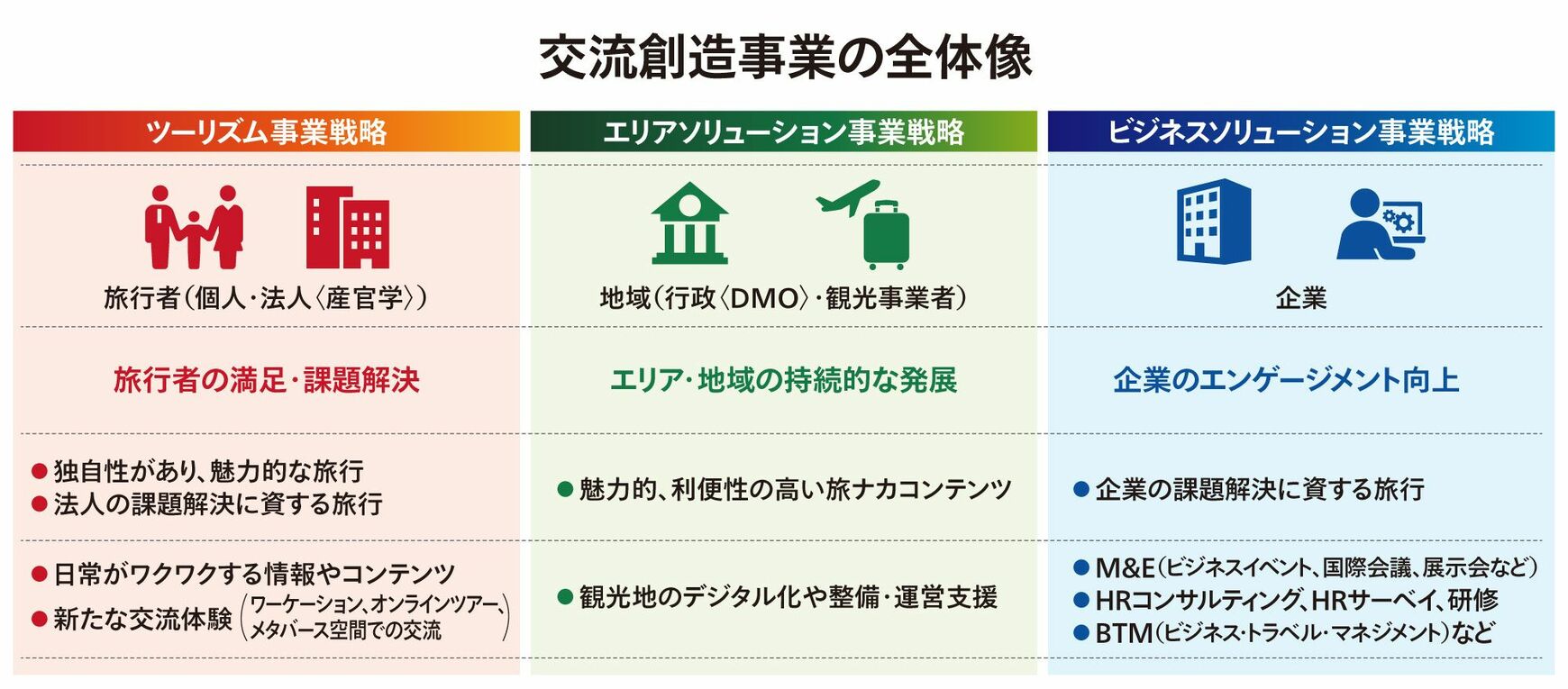交流創造事業は、大きく「ツーリズム事業」「エリアソリューション事業」「ビジネスソリューション事業」の3つの事業軸で構成される。