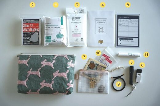 携帯トイレは凝固剤がいらないタイプ。アルミシートは静音タイプを入れています。基本キャッシュレス決済なのですが、現金(小銭)も必ず持ち歩いています。