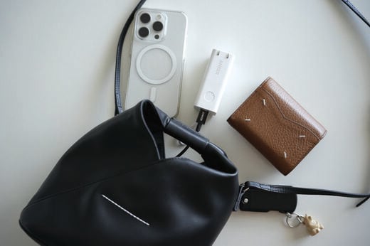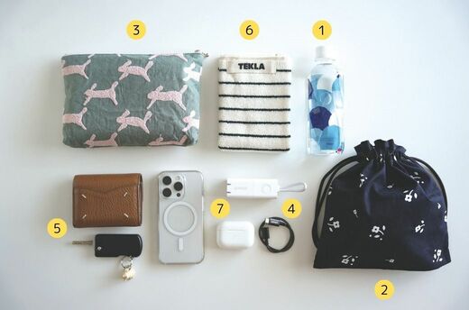 水は310mlのペットボトル。重すぎずコンパクトで、飲みきれる量がちょうどよく、普段のお出かけにもバッグの中に入れています。巾着の中にはリップカラーなど細々したものをまとめています。モバイルバッテリーは常にスマホとセットで持ち歩きます。外出先でもコンセントさえあればモバイルバッテリー本体に充電できるものを選んでいます。