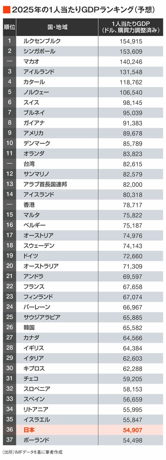 IMF(国際通貨基金)が出している2025年の最新の予想では、日本の1人当たりGDP(購買力調整済み)のランキングが36位まで下がっています。この数年で、韓国にもイタリアにもスペインにもチェコにも抜かれてしまいました。
