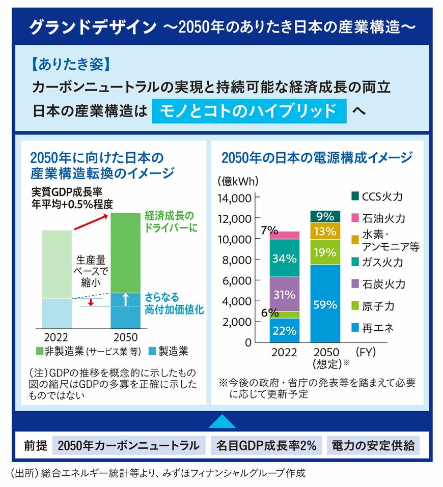 はい。〈みずほ〉では、2050年カーボンニュートラルの実現に向けて「2050年の“ありたき”日本の産業構造」を検討し、グランドデザインとして公表しました※。もちろんこれはあくまでも仮説です。世の中で議論のたたき台としていただき、持続可能な社会の実現に向けた道筋を探ることに貢献したいと思っています。
