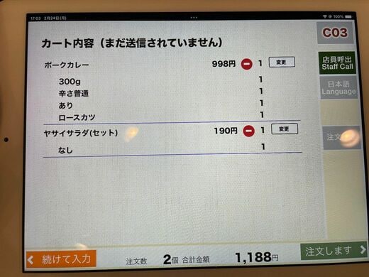 この値上げでは、ポークカレー(ライス300g)が、東京都・神奈川県・大阪府で591円から646円と55円の価格上昇。その他の地域では570円から646円と76円の値上げになっている。