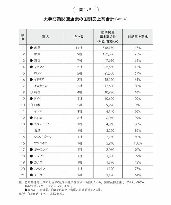 表1‐5の大手防衛関連企業の売上高でも、欧州NATOの合計額はやはりアメリカの4割程度である。一方でアメリカは41社であるのに対して、欧州NATOは26社となっている。つまり平均すると、欧州の1社当たりの売り上げはアメリカの約6割だ。同じNATOといっても、欧州にとってアメリカの背中はこれ程遠いものとなっている。