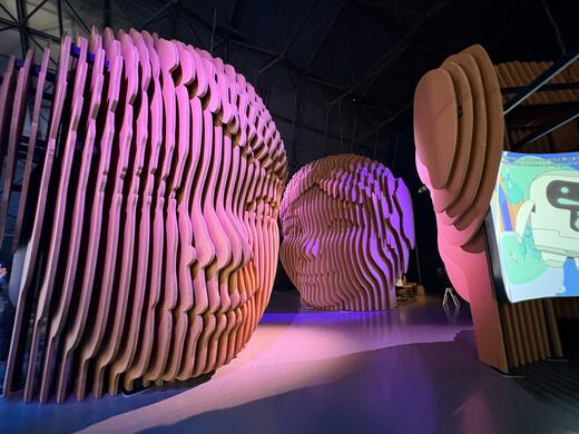 さらにホールCに進むと、ここには10者が展開する未来技術のアトラクションが並んでいる。入り口付近には高さ5.5mの巨大なロボットヘッド型ミニシアターが4つ設置されている。この模型は資源循環への配慮から、すべてダンボール素材で作られている。