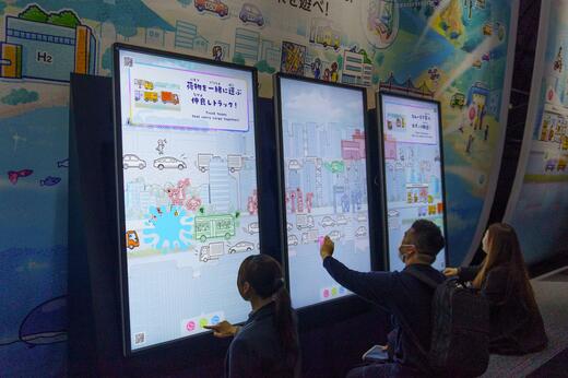 椅子が備え付けられたロボットヘッドの背面に腰を下ろすと、交通・モビリティ、環境・エネルギー、ものづくり・まちづくり、食・農といったSociety 5.0の主要テーマを、子どもにもわかりやすいアニメーションで学べる仕組みになっている。各映像はいずれも著名なクリエイターが手掛けている。