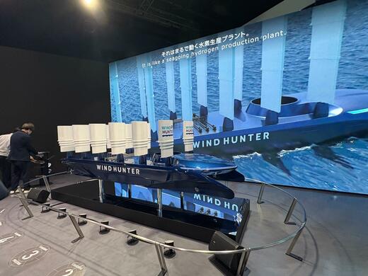 商船三井が提案するのは、脱炭素社会の実現を視野に入れた次世代船舶技術「ウインドハンター」だ。硬翼帆式の風力推進システム「ウインドチャレンジャー」をベースに進化させ、走行中に洋上風力を活用してグリーン水素を生産・貯蔵・運搬するという、究極のゼロエミッション船を目指している。