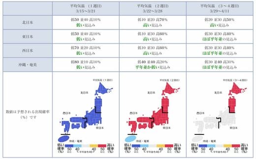 一転、3月22日から28日は晴れる日が多く、平均気温は北日本から西日本で平年より高い見込みです。3月29日から4月11日は、北日本は平年より高く、東日本と西日本はほぼ平年並みになるでしょう。