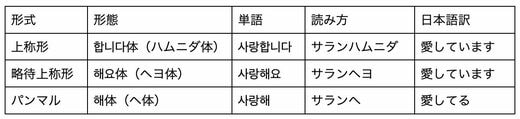 ここでは、韓国語の「愛してる」という表現を例に挙げ、主に使われる待遇法の違いを表にまとめました。言葉遣いがどのように変化するのかを見てみましょう。