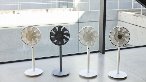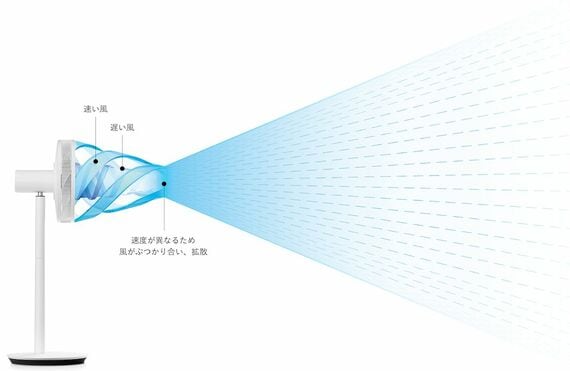 これには、DCモーターによって微風が生み出せる制御力のほかに、特許を取得している特殊な羽根の構造に秘密があるようだ。二重構造の羽根により生まれる風は、速度が異なるために途中でぶつかり合う。それによって、風が放射状に大きく広がり、まるで木陰でうたた寝しているようなふんわりとやさしい風を再現できるのだ。