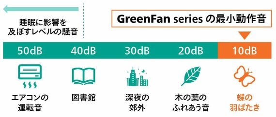 バルミューダの調査によると、風量1に設定したときの動作音は、約10dBであり、これは「蝶2匹の羽ばたきとほぼ同じ」だとか。そもそも蝶の羽ばたきは聞いたことがない。それくらいに静かということだ。
