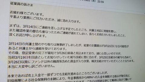 その新経営陣は3月17日、従業員向けに「給与支給に関するご案内とお詫び」と題したメールを送信。「当初3月19日を目途としてお知らせしていた給与支給に間に合わず、3月25日支給分の給与も含めて(中略)資金が入り次第、順次支給させていただくこととなります」と通知した。