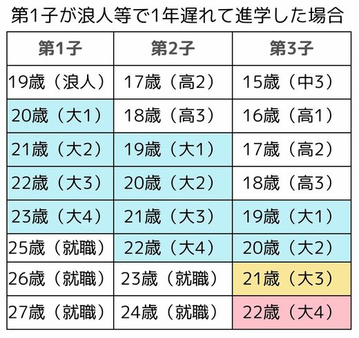 子どもの進学は、必ずしも親が思い描いたライフプラン通りに進むとは限らない。下の表では、第1子が大学受験で浪人したり、高校時代に留学したりすることで、大学進学が1年遅れたケースを想定している。