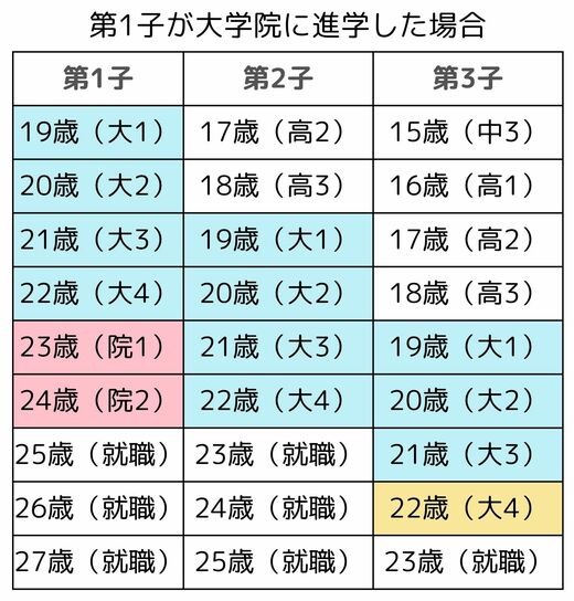 さらに下の表では、第1子が大学院に進学した場合を想定している。現在の制度では、大学院の授業料は無償化の対象外だが、大学院生であっても扶養対象の子どもとしてカウントされる。