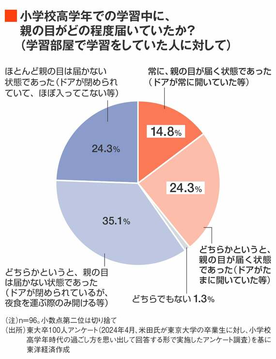 「自分は常にドアオープンで親の目が届いた状態で勉強していた記憶があったので、他の東大生はどうだったのかという疑問意識があり、これについても東大の卒業生にアンケートを行いました。アンケートでは『学習部屋』のみに限定していたにもかかわらず、『常に親の目が届いている』『どちらかというと親の目が届いている』人が合計して約3割という結果に。一見低い数値のように見えますが、リビングと比較して目が届きづらいはずの学習部屋でこれだけの数値になっています」