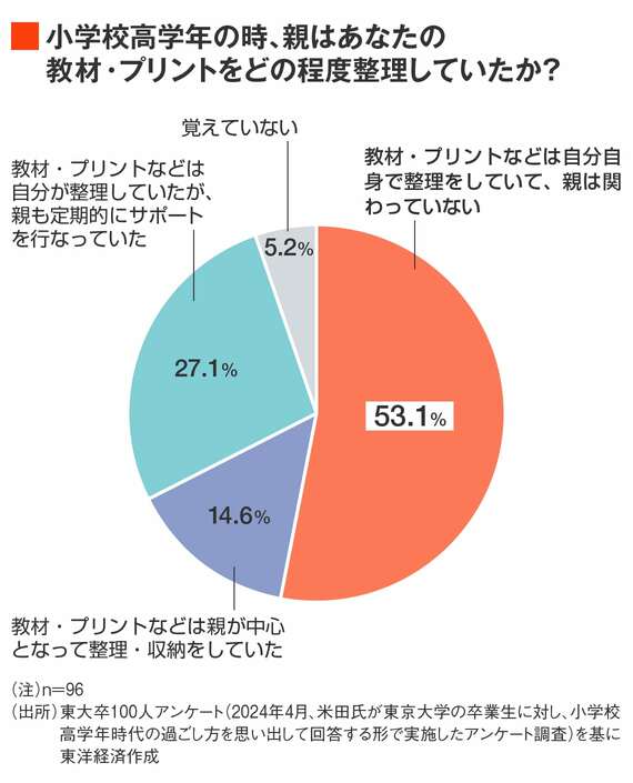実際に東大の卒業生に対するアンケートでも、「小学校高学年の時、親はあなたの教材・プリントをどの程度整理していたか?」という質問では、半数以上の人が「自分自身で整理をしていた」という結果が出ているという。