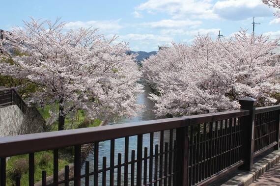 「であい橋」の名前の由来は、橋自体がY字になっていることによるもの。京都で桜の名所といえば、嵐山や天龍寺、八坂神社、清水寺などが思い浮かびますが、こちらは京都駅を挟んで反対側の伏見区で、いわば穴場と言えるでしょう。京阪電車中書島から徒歩約8分で、付近は酒蔵などが立ち並ぶ歴史ある街となっています。