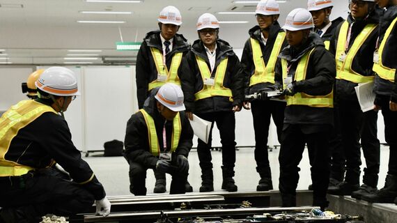 実物大の線路の上で、外国人の研修生たちに向かって、日本人の教官が日本語で説明している。