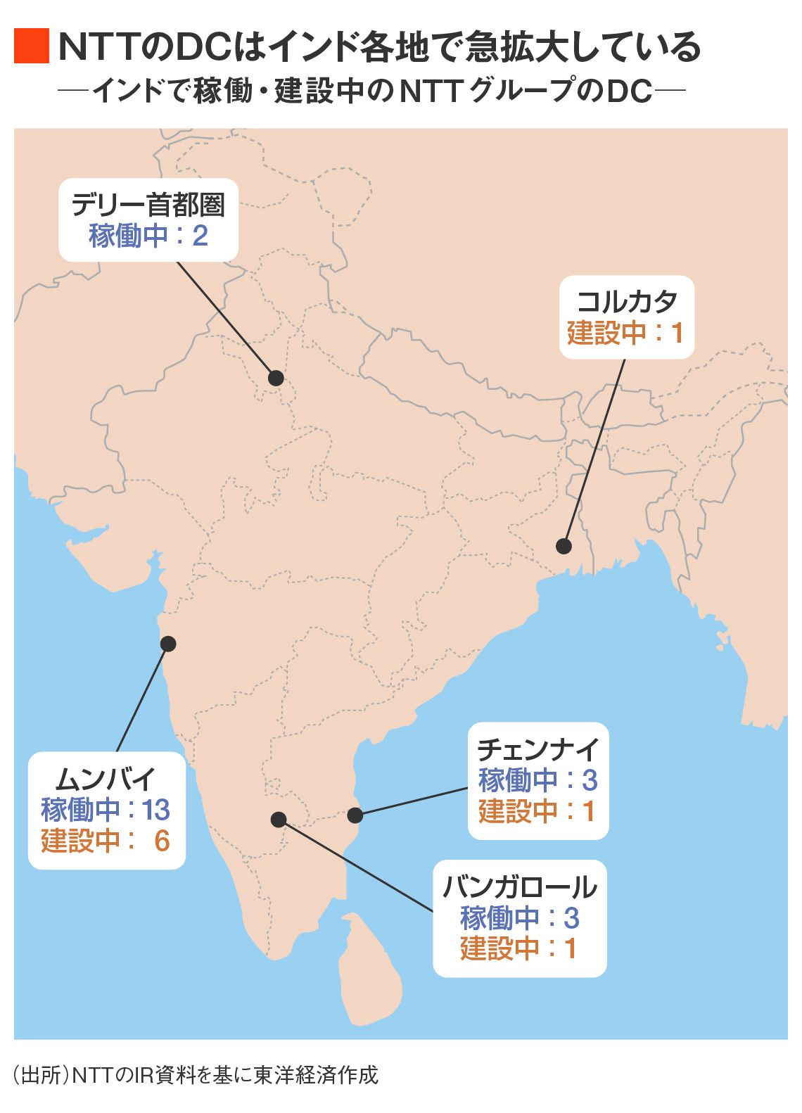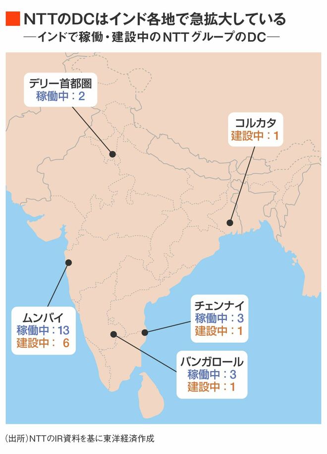実はNTTグループは、インドのDC市場で約3割のトップシェアを誇る。2012年にDC事業を展開する現地のネットマジック・ソリューションズ社を買収したのを足がかりに、インド向けのデジタルインフラに積極投資してきた。デリー、チェンナイ、バンガロールも合わせた4都市で計21棟(2024年2月時点)のDCを運営しており、DCの規模を示すITロード(DC内のIT機器向け供給電力)は計290メガワットに上る。