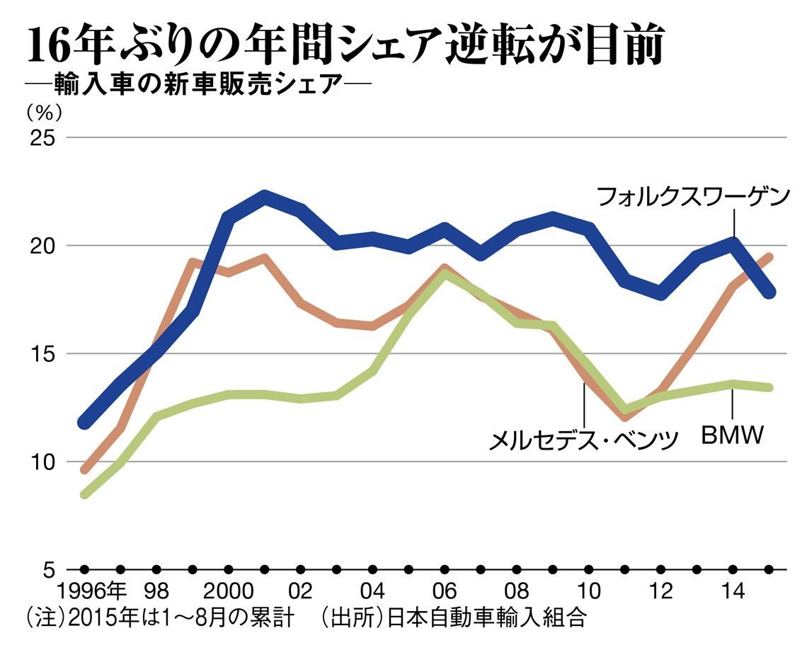 もっとも、今回の問題が発覚する前から、新車販売は苦戦していた。今年上半期(1~6月)は前期比16.5%減の2万9666台。輸入車販売でトップシェアを10年以上保ってきたが、今回は半期ベースでメルセデス・ベンツ(3万2680台)の後塵を拝した。関東エリアで複数ブランドの輸入車を扱う販社の担当者は、「最近のVWは新鮮味に欠け、売れる車種が出てこない」と不満を漏らす。