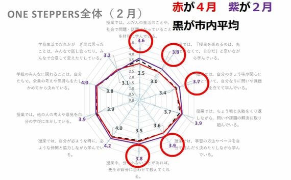2024年度、個別の研究テーマとして多かったのは、自由進度学習やPBLだという。そうした実践の広がりにより、一定の成果も得られた。同市は年に4回、前述の山口氏が開発した「ScTN質問紙」を使って主体的・対話的で深い学びの実現状況を測定しているが、そこに変化が表れた。