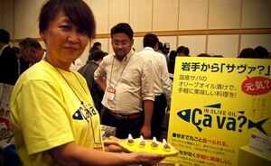 オイシックスなど大手食品企業が参加する復興支援組織「東の食の会」と連携して震災後に新たに国産サバのオリーブオイル漬け缶詰の開発を手掛けたのが、岩手県内の第三セクター「岩手県産株式会社」だ。「Ça va(サバ)?」(フランス語で「元気?」)と青い字で書かれた真黄色のラベルが目を引く。製造は津波被害が大きかった岩手県沿岸部の水産加工会社が担当。都内にある岩手県のアンテナショップ「いわて銀河プラザ」を発信基地にして、大手スーパーの復興イベントなどでも販売実績がある。