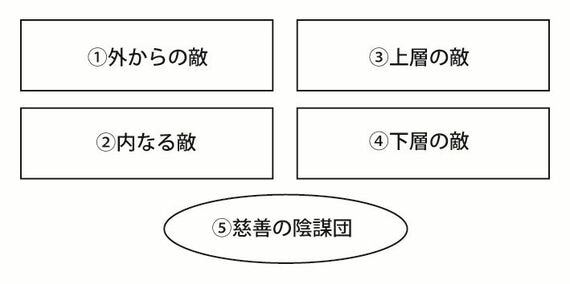 1つ目は「外からの敵」で、敵国やコミュニティの部外者による悪事の企みを指す。次が「内なる敵」で、同じ国民と見分けのつかないよこしまな隣人から構成される。3つ目は、社会階層の上部にいる政治家やエリートなどの中に身を隠す「上層の敵」で、4つ目が一般的に社会階層の下部に振り分けられることが多い移民やマイノリティなどの「下層の敵」だ。最後の5つ目は、そもそも敵ではなく、人々を助けるために陰で密かに活躍する「慈善の陰謀団」だ。