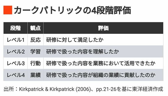 カークパトリックの4段階評価法※3では、参加者が満足したか=反応、参加者が内容を理解したか=学習、参加者が内容を業務において活用したか=行動、組織の成果に貢献したか=業績という4つの観点で研修を評価できることを示している。