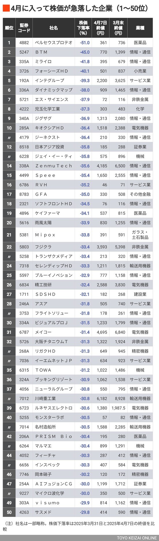 政治・経済・投資 「トランプ関税ショック」で株価が急騰&急落した200銘柄ランキング、大逆風相場で逆行高を記録した"内需好調株"とは? 3分で読める 公開日時:2025/04/07 19:30 東洋経済オンライン編集部 フォロー 1/5 PAGES 2/5 PAGES 3/5 PAGES 4銘柄が4割超の大幅下落 次ページが続きます:【株価下落率51~100位は?】 4/5 PAGES 5/5 PAGES