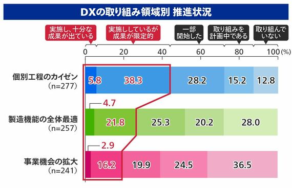 しかし、製造業におけるDXは、その真の価値を発揮できていないのが実情だ。製造業ではいまだ「個別工程のカイゼン」に関する取り組みが44.1%と多く、「製造機能の全体最適」や「事業機会の拡大」を実施している割合は少ない。