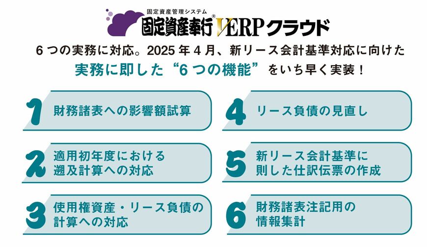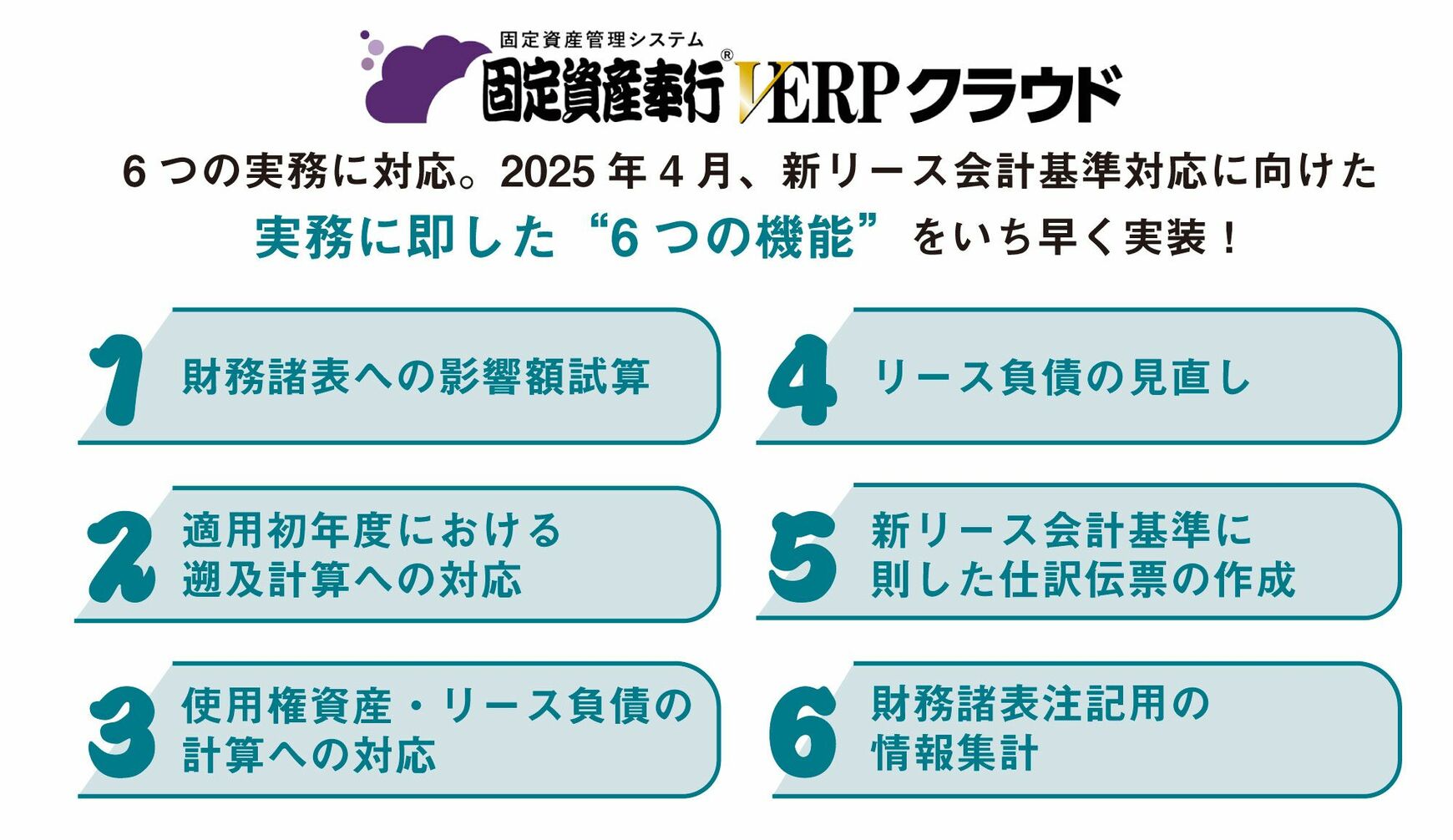 「固定資産奉行V ERPクラウド」は、25年4月に新リース会計基準への対応機能の提供を開始した。すでに「財務諸表への影響額試算」「適用初年度における遡及計算への対応」「使用権資産・リース負債への対応」「リース負債の見直し」「新リース会計基準に則した仕訳伝票の作成」「財務諸表注記用の情報集計」などの機能が標準で実装され、実務対応が可能である。