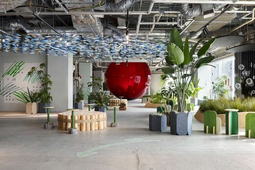 「商業施設」なのに、お店ではなく「憩いの場」が広がっているという驚きと、非日常感を感じさせます。