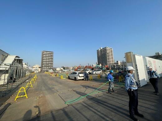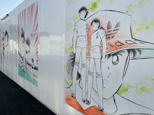現場は背の高いパネルで覆われ、地元出身の漫画家・高橋陽一さんの描いた「キャプテン翼」の表紙絵が貼り出されている。