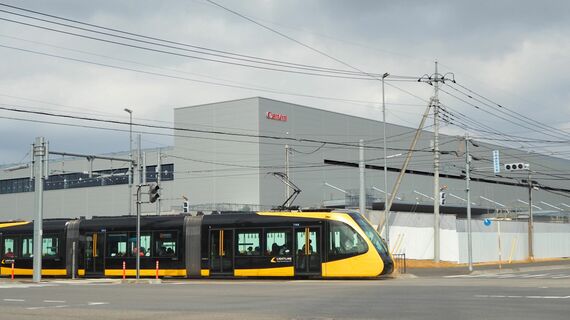 黄色がシンボルマークの車両「宇都宮ライトレール」が走る、線路脇の広大な敷地――。栃木県宇都宮市の清原工業団地で、キヤノンの半導体露光装置の新工場建設が進んでいる。