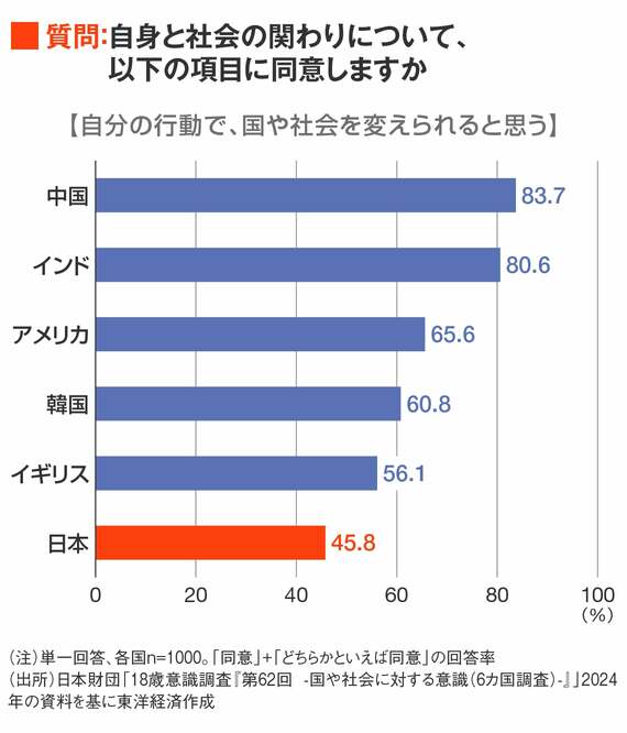 そう問われたとき、あなたはどう答えるだろうか。日本財団の18歳意識調査で「はい」と答えた日本の18歳の割合は45.8%。6カ国で最下位だった(下記の図)。