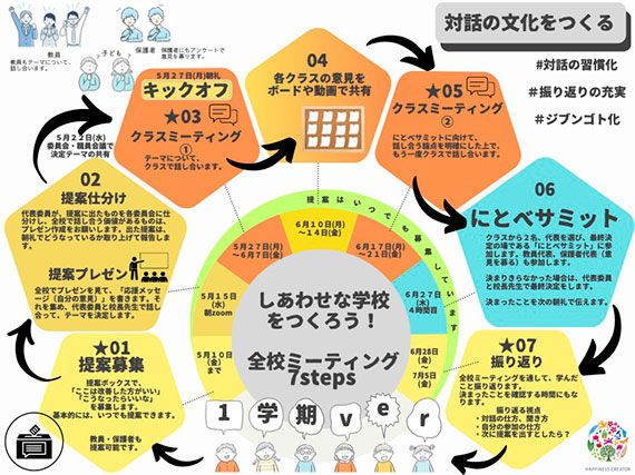 にとべサミットとは、各クラスの代表2名、代表委員、教員代表、保護者代表(教員が代わりに担当する)が一堂に会する場のこと。Zoomで全クラスに中継され、全校児童が視聴する。児童はチャットで意見や応援コメントを送ることも可能だ。そして、原則、にとべサミット内で新たなルールやアイデアの最終決定を行う。ただ、45分の時間内に決まりきらなかった場合は、代表委員と校長が最終決定をする。