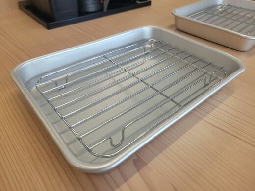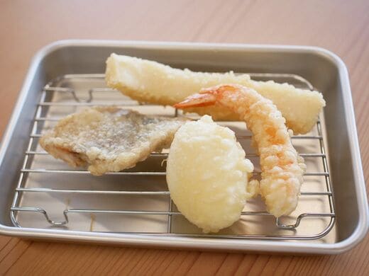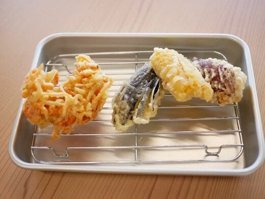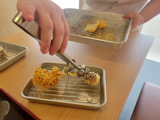 客席にはあらかじめ天ぷらを置くためのバットが置かれていた。しばらくするとスタッフが再度やってきて、揚げたての天ぷらをトングでこちらのバットに一つずつ移してくれた。最初に野菜の天ぷら数品が提供され、さらにもう一度、時間差で海鮮系がやってきた。計2回のサーブで注文内容のすべてが出揃った。