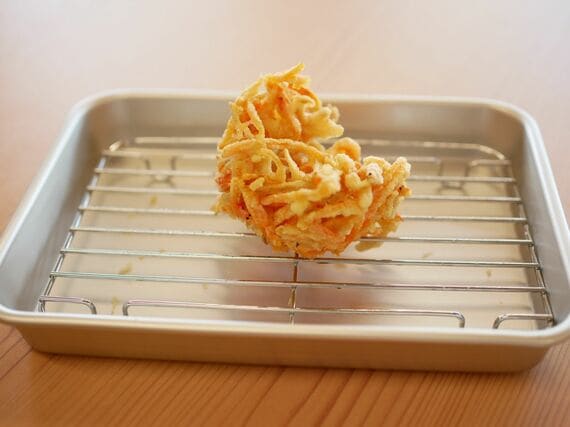 特にそれがよく表現されているのが「謹製かき揚げ」だ。具材はゴボウ、ニンジン、サクラエビ。ゴボウとニンジンは細切りにされており衣をまとう面積が大きくなるが、衣は薄いので口に入れたときのバランスが絶妙だ。かき揚げにありがちなダマはない。
