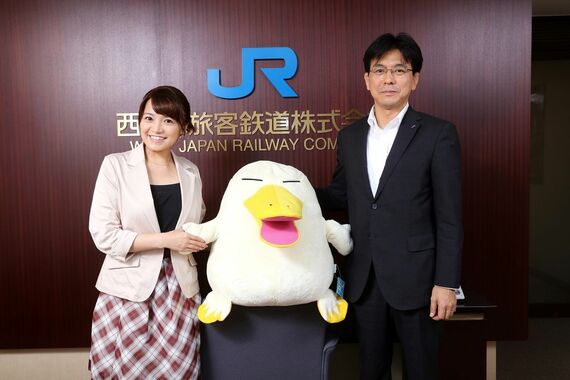 JR西日本の春名・東京本部副本部長と大阪出身の久野・女子鉄アナウンサー(撮影:尾形文繁)