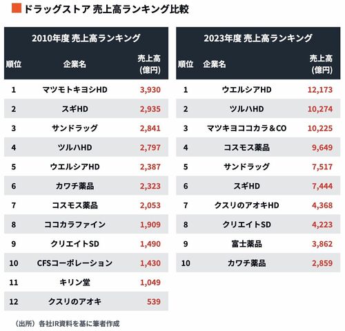 以下は2010年と2023年のランキングである。これを見ると上位企業の売上規模が何倍にも増えていること、ウエルシア、ツルハの躍進と統合後の存在感の大きさを認識していただけるだろう。